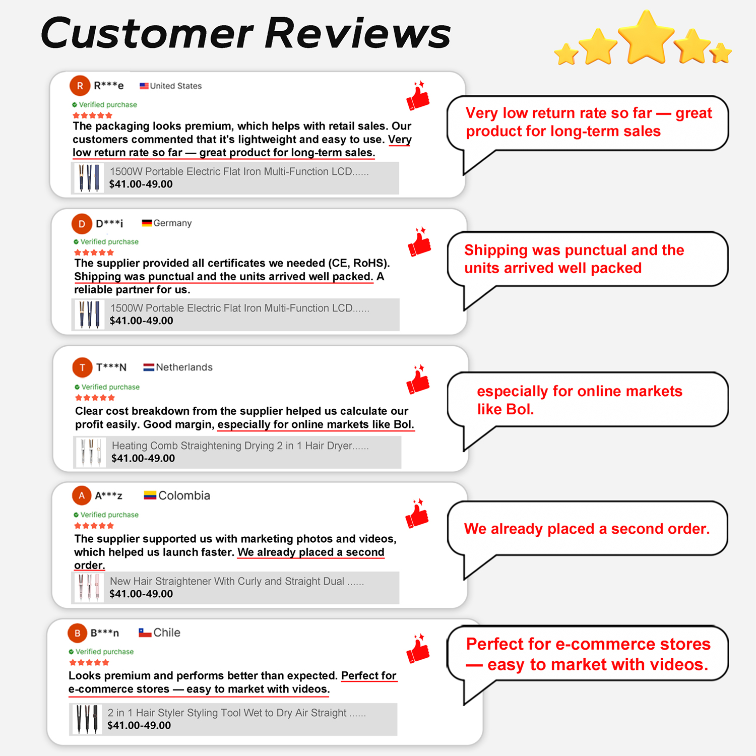 ”Unbelievable shipping speed, and you guys respond so quickly! Customer service is top-tier. The hair tools exceeded my expectations, great picks!”